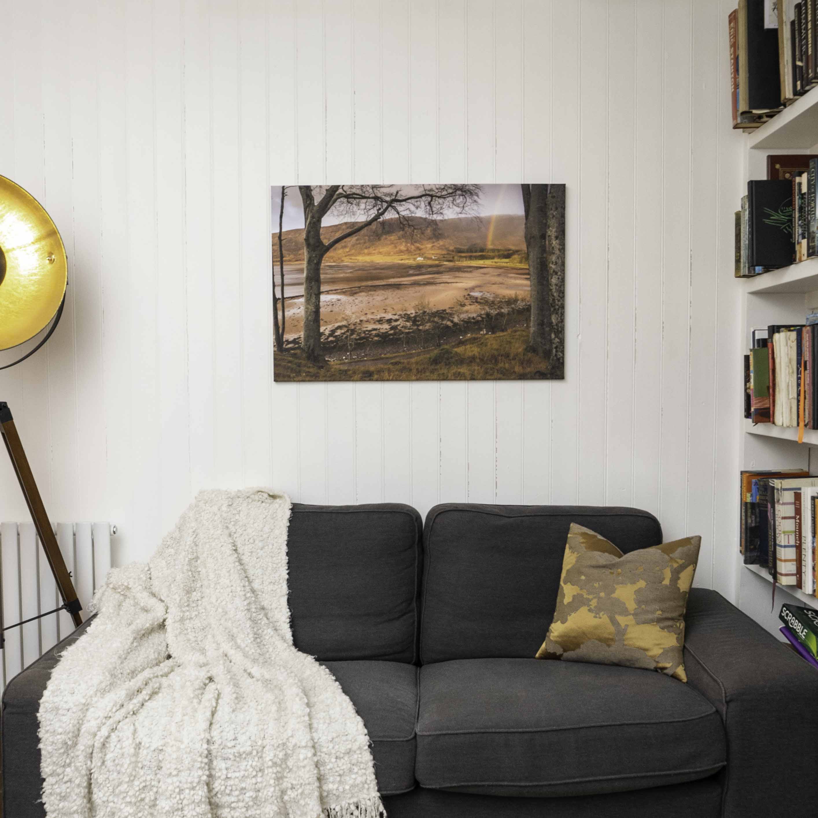 Capture the serene beauty of the Scottish Highlands with this stunning framed canvas, featuring the mesmerising Applecross Bay bathed in warm, golden light and crowned with a delicate rainbow. Photographed by Jack in the Autumn, this scene is a perfect blend of natural majesty and tranquil charm, showcasing the timeless landscape of Applecross.
