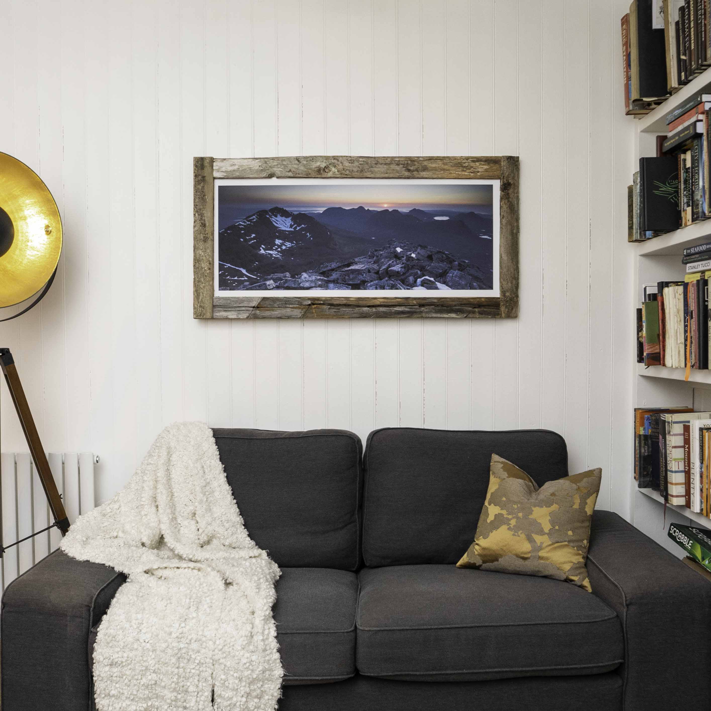 This sunset panorama taken from the summit of Liathach is perfect for anyone who enjoys hiking this area of the Highlands, with epic views from the Torridon hills to the Trotternish ridge on the Isle of Skye. The muted cool-blue shades are complemented by the warm pastel hues of the sunset, allowing this to work in a variety of spaces.