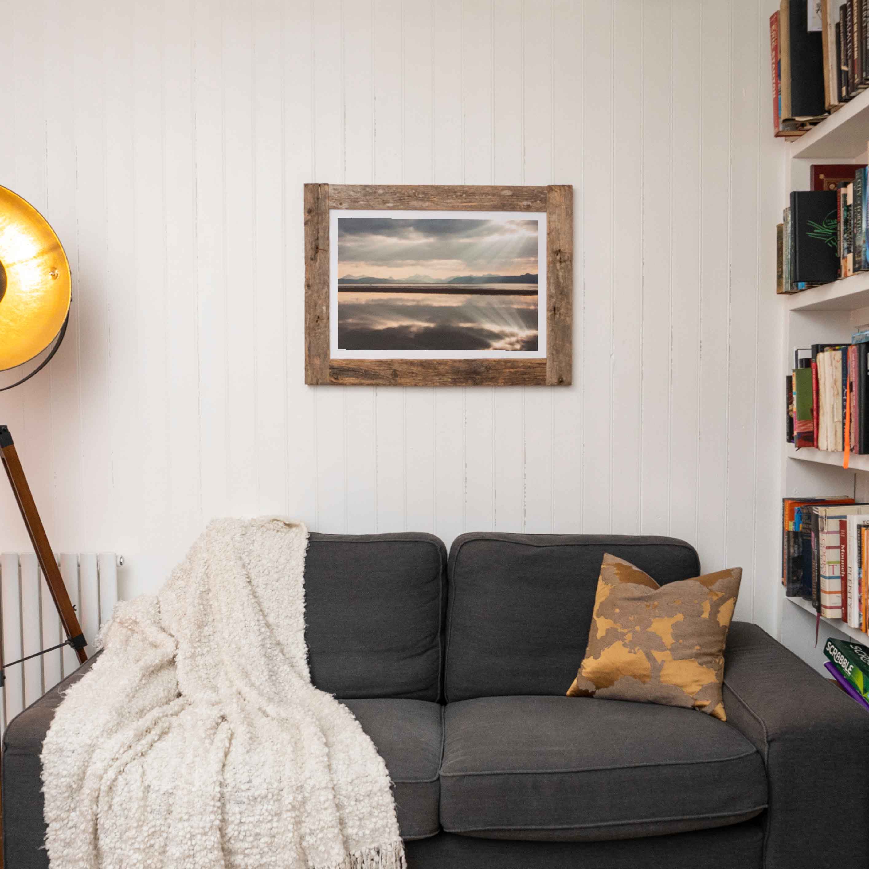 Immerse yourself in the breath taking beauty of the Highlands with Sand Reflection. This piece captures a serene scene overlooking the Isle of Skye and Raasay, where gentle rays of sunlight break through a moody, clouded sky to reflect off the calm waters of Applecross Bay. The distant silhouette of Skye and Raasay adds depth and wonder, making it a view that feels timeless and deeply connected to Scotland's wild landscapes.